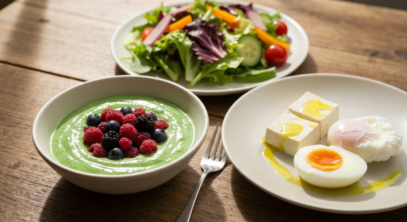 - 저녁: 콩밥 반공기 + 두부부침(에어프라이어) + 샐러드(올리브오일·식초)